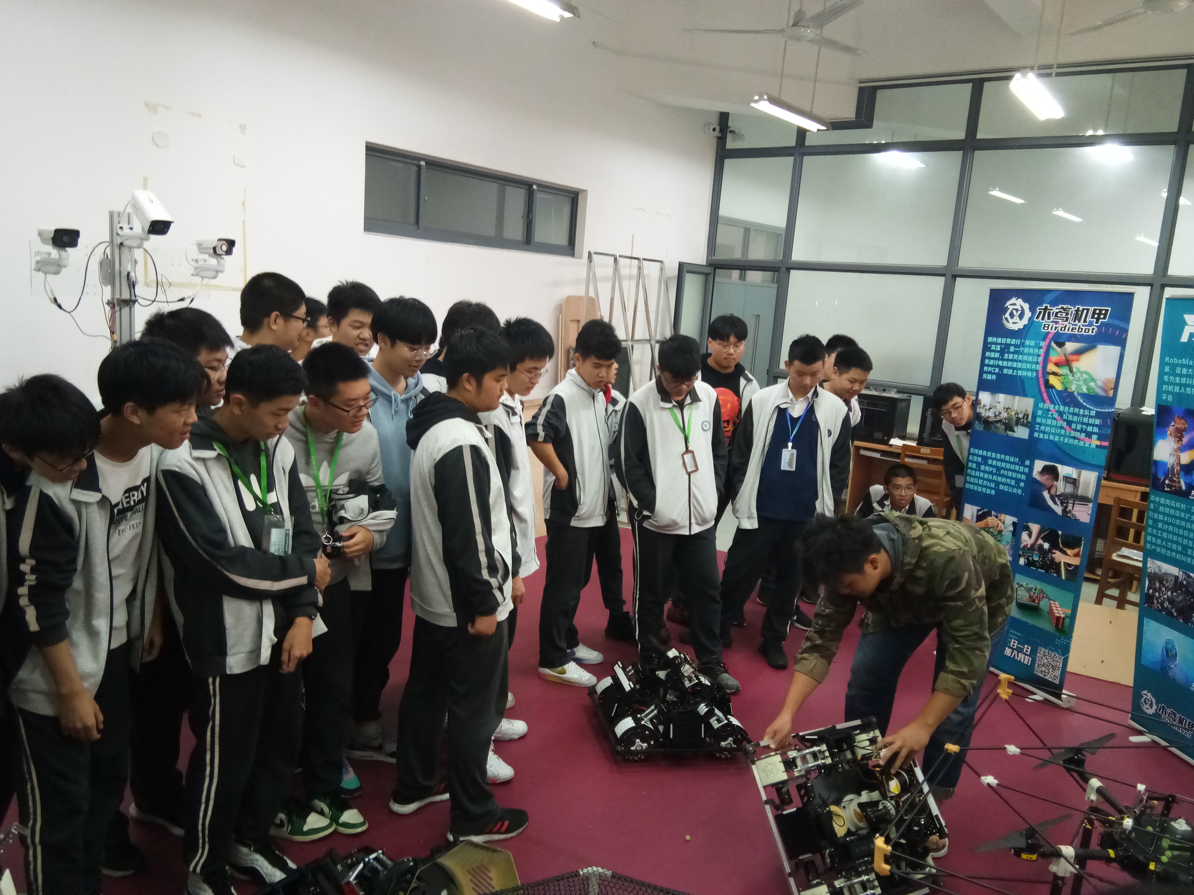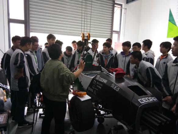 在工程大赛车队战绩榜上,同学们目睹了学校锐狮方程式车队、龙腾虎跃节能车队、龙腾巴哈车队的赫赫战果、累累荣誉。展厅里的几辆赛车,每辆身上都有精彩的故事,每辆身上都有昔日的光芒。在学院大学生创新创业工作室,同学们看到多名大学生正在潜心研究如何改进赛车零部件,他们身上的那种钻研精神和专注品质,为大家上了生动一课。学长们还热情、专业地向同学们介绍赛车知识,大家仔细聆听,不时发出赞叹和钦佩之声。
