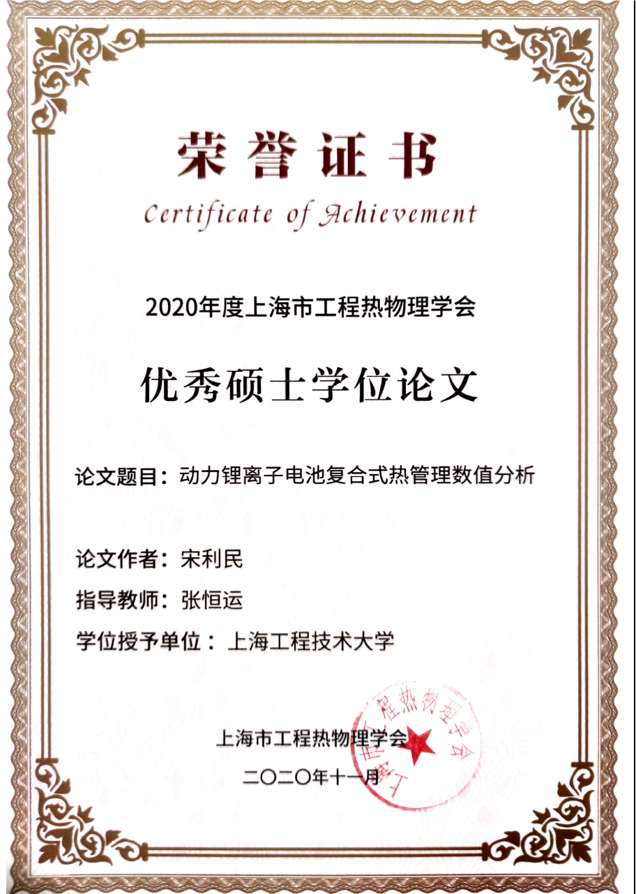 上海市工程热物理学会第九届会员代表大会于2020年11月29日在上海交通大学召开,会上颁发了2020年度上海市工程热物理学会优秀博士学位论文奖和优秀硕士学位论文奖,我校金沙威尼斯欢乐娱人城宋利民同学的硕士学位论文《动力锂离子电池复合式热管理数值分析》,荣获学会优秀硕士学位论文奖,指导老师为张恒运教授。本届参评论文为2018年1月1日至2020年6月30日获得博士硕士学位者的学位论文。