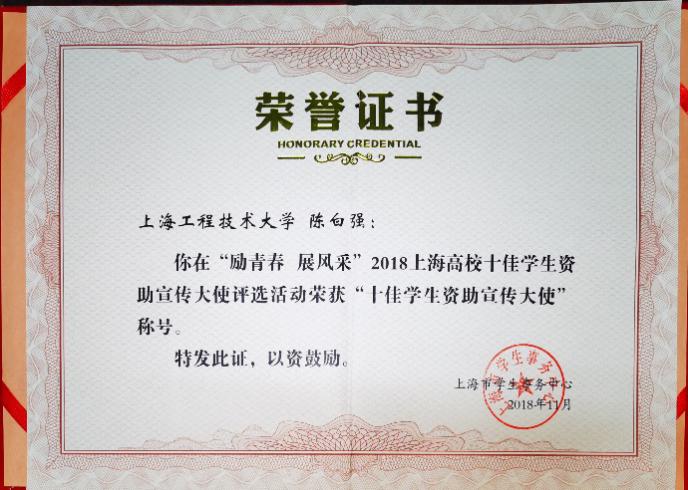在校担任资助宣传大使,陈白强利用暑寒假时间积极回乡宣传资助政策,采取线下讲解了解同学具体情况、线上微信推送宣传推广、微电影励志故事宣传等方式,多方位展示国家及学校的资助政策,让国家资助政策为更多的贫困学子所知,通过由“扶贫”到“扶志”,让他们能够意识到读书的重要性。陈白强做作出的努力取得了成果,获得了学校与上海市事务中心的认可,被评为上海市十佳资助宣传大使。