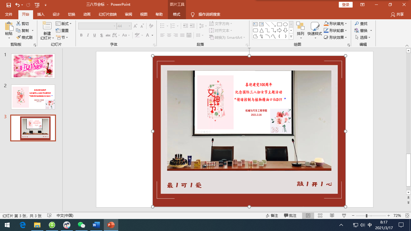 在三八妇女节到来之际,也是我校十四五开局之年,2021年3月16日下午金沙威尼斯欢乐娱人城女教师欢聚一堂,开展了喜迎建党100周年纪念国际三八妇女节主题活动“情绪控制与植物精油口红DIY”,活动邀请国家植物精油疗法高级康复理疗师周怡老师和她的团队,讲述精油的起源、制作和作用,并带领老师们制作了一支精美的植物精油口红。