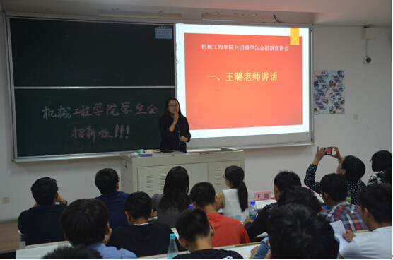 917日晚在教学楼F106,工程学院学生会举办了2015级机械学院学生会招新宣讲大会。机械工程学院团委书记王璐老师、办公室主任曹雅致老师以及汪文婷、柳苗苗、王淼三位辅导员老师受邀出席。