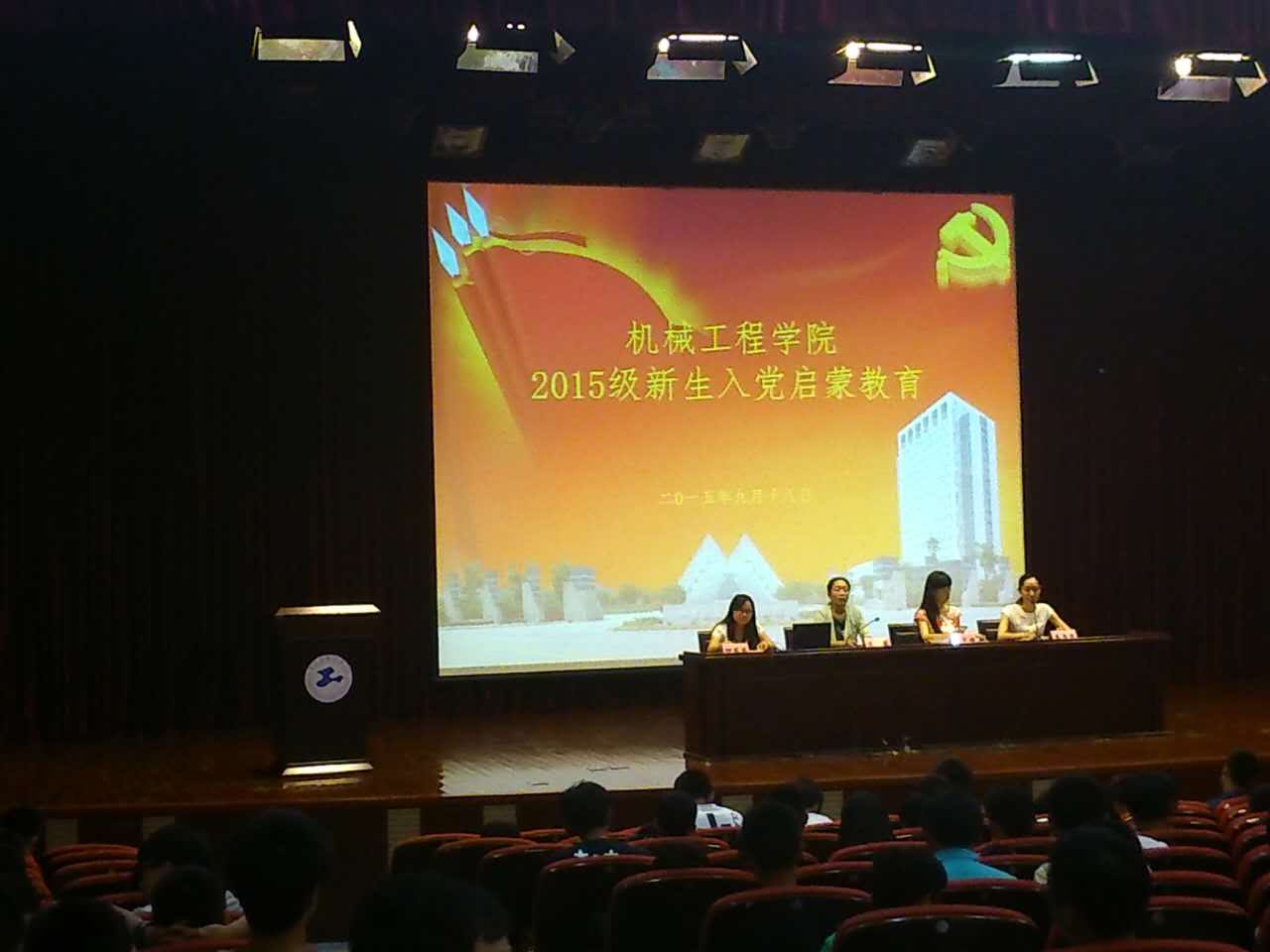20150918日下午,金沙威尼斯欢乐娱人城机械工程学院党委在志宏堂召开2015级新生入党启蒙教育大会,学院党委书记虞蓉、副书记梅元媛、学生科创党支部柳苗苗以及组织员李雪苗出席会议。
