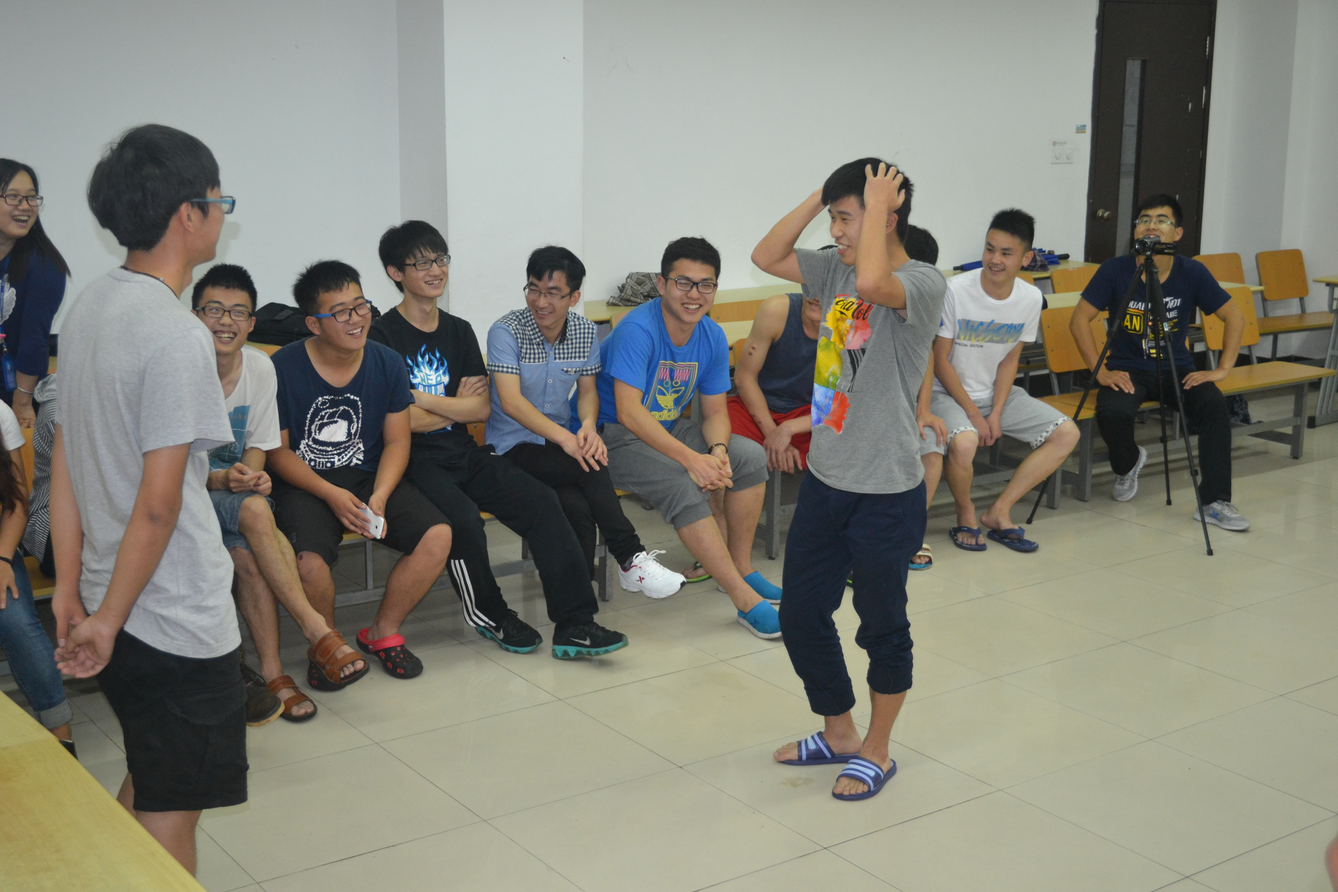 最后一个互动游戏由学院朋辈心理站黄炜钰同学主持,这个游戏叫做“你来比划我来猜”,两人一组,一个人比划大屏幕上的词,另一人背对大屏幕猜词,一分钟之内看谁答对的词最多。随着游戏的深入进行,活动也达到了高潮,每个人都聚精会神地集中在游戏者的语言和动作中,不时会因为参与者的滑稽幽默而捧腹大笑。