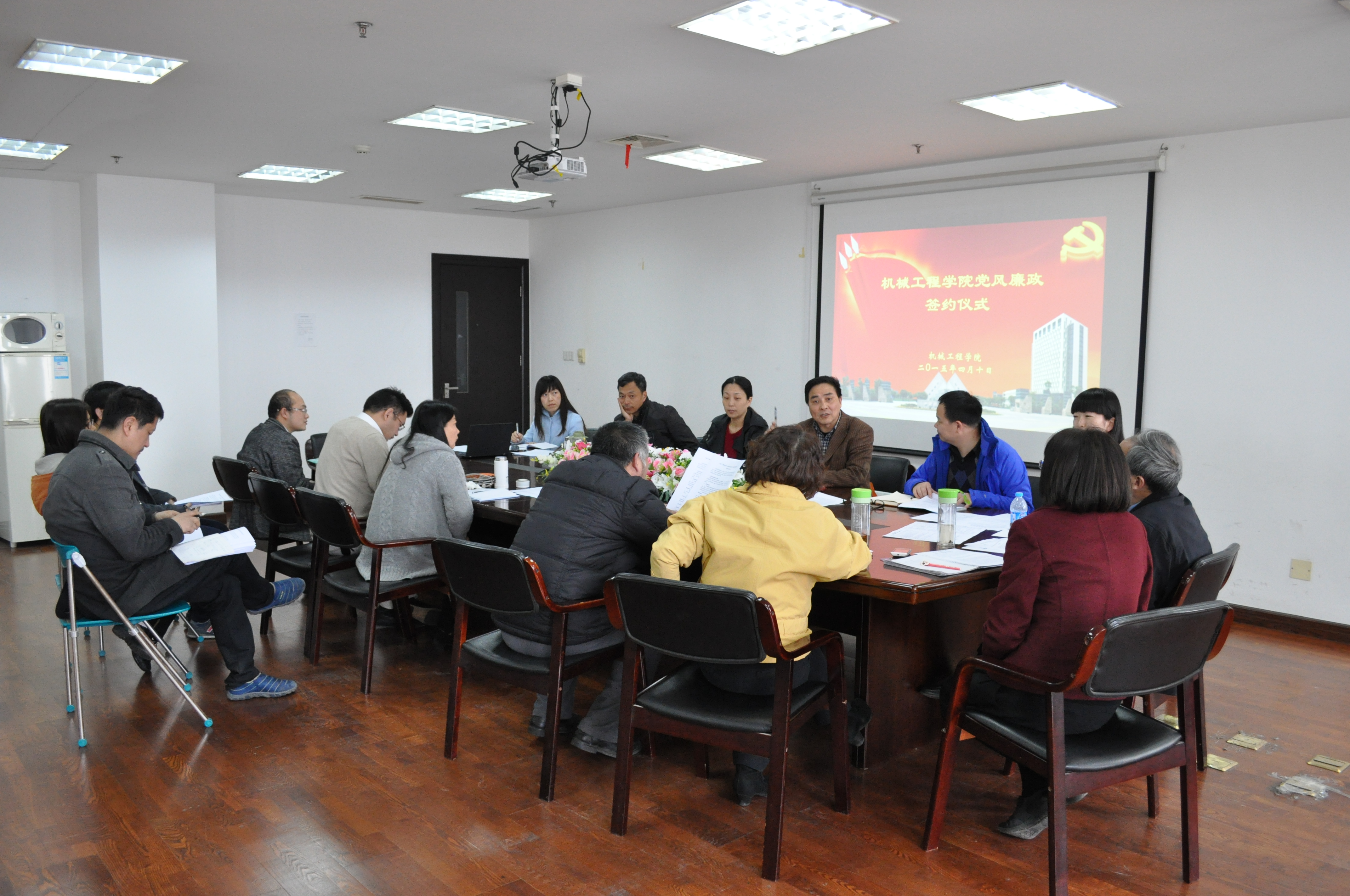 4月10日下午,机械工程学院2015年度目标责任暨党风廉政建设责任签约仪式在会议室举行,学院全体班子成员及系室主任出席了会议,会议由院长程武山主持。