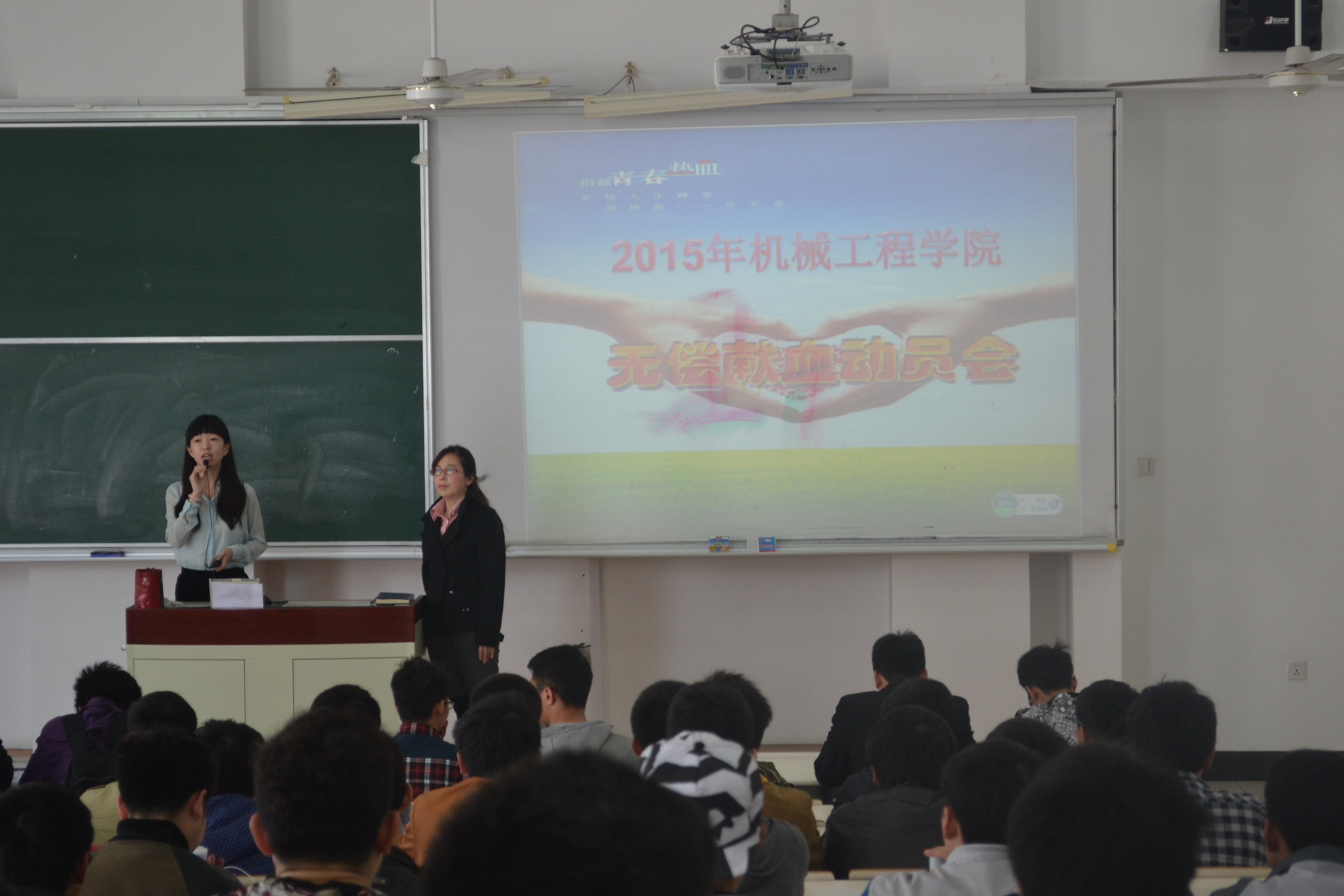 3月31日下午,机械工程学院在教学楼C320室召开了2015年学院无偿献血工作动员会。学院党委副书记梅元媛老师出席会议,学院辅导员及准备献血学生参加了会议。