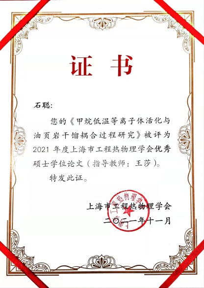 11月6日,上海市工程热物理学会第九届理事工作会议暨2021学术年会在上海科学会堂(南昌路47号)召开,会上颁发了2021年度上海市工程热物理学会优秀博士学位论文奖和优秀硕士学位论文奖,我校金沙威尼斯欢乐娱人城石聪同学的硕士学位论文《甲烷低温等离子体活化与油页岩干馏耦合过程研究》,荣获学会优秀硕士学位论文奖(硕士学位论文排名第一),指导老师为王莎副教授。本届参评论文为2019年1月1日至2021年6月30日获得博士硕士学位者的学位论文,其他获奖单位包括上海交通大学、复旦大学、同济大学、华东理工大学、上海理工大学、上海电力大学。