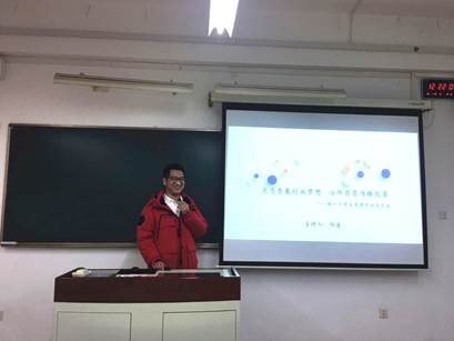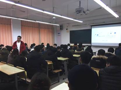 1月15日,金沙威尼斯欢乐娱人城2013级校友向建在教学楼B215开展创业经验分享的讲座。学院党委副书记王东阳、辅导员汪文婷、王淼出席。