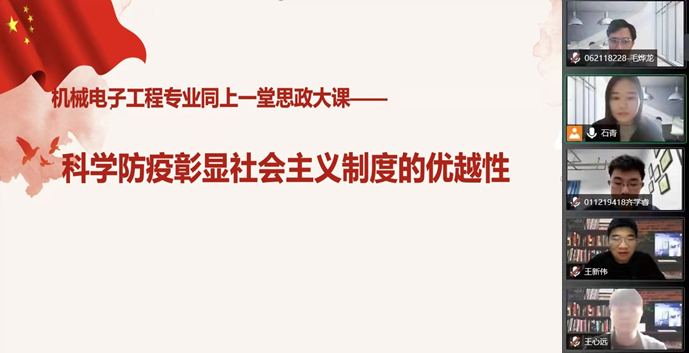 辅导员老师吕悦、许库尔等围绕“社会主义制度的优越性”、“爱国是最大的责任担当”等具体问题带领学生展开了深入学习讨论,李振老师将思政大课内容融于形势与政策课中,其他辅导员通过线上主题班会的方式向学生讲述了中央疫情防控的总方针,上海及我校在这一阶段疫情防控的总要求。学生们认真听课,积极思考,互动交流学习体会和感悟。