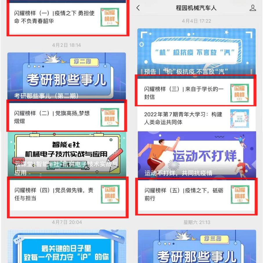通过深挖学生典型事迹,讲述在校园抗疫志愿服务过程中的点滴故事,在“程园机械汽车人”微信公众号号平台上持续报道“闪耀榜样系列”共计五期内容,在同学们之间产生了广泛模范带动作用。通过宣传学生志愿者代表故事,充分发挥朋辈教育在疫情之下所起到的等方面的育人潜能和价值,做到朋辈引领、知行合一。