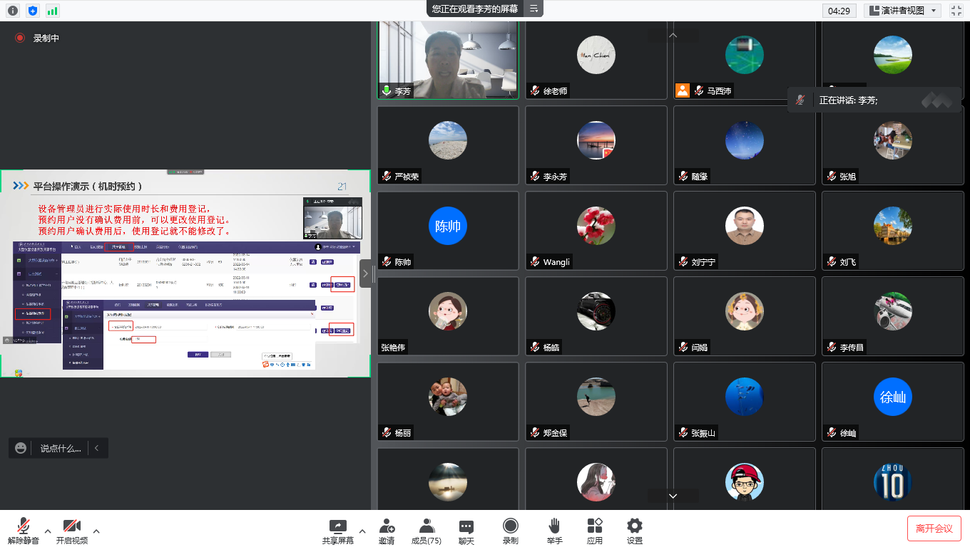培训会上,学校资产与实验室管理处李芳老师以《大型仪器设备管理相关制度内容解读》和《大型仪器设备共享平台培训》为主题,就大型仪器设备管理办法、共享平台管理实施细则和共享平台使用操作方法进行了专项培训。同时,结合老师们的相关问题,针对大型仪器设备共享收费标准的设定、共享考核等问题,现场一一解答。