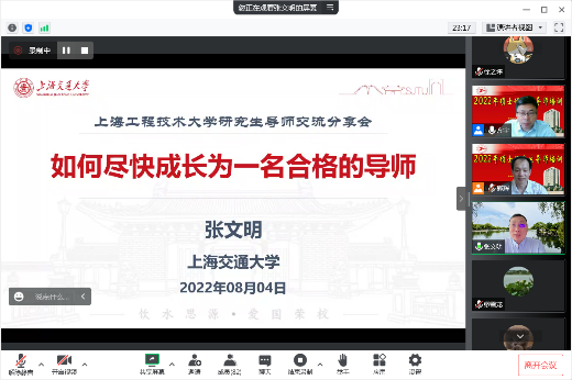 8月4日,金沙威尼斯欢乐娱人城邀请上海交通大学特聘教授、博导张文明教授开展题为“如何尽快成长为一名合格的导师”的线上导师培训会。学院领导班子、全体研究生导师参加了会议本次导师培训会,院长方宇主持会议。