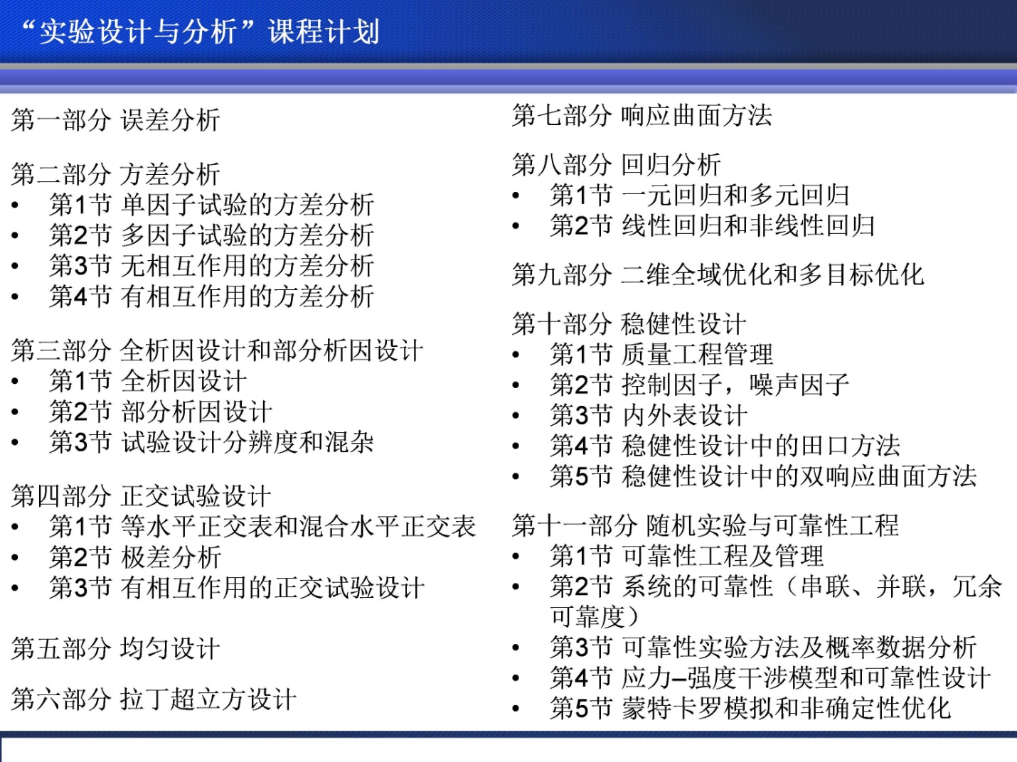 辛教授在论述试验设计的发展中,从正交设计、均匀设计、拉丁超立方设计谈到响应曲面方法。他指出极差分析、方差分析、回归分析作为试验设计的三大分析手段的重要性和计算方法。在论述稳健性设计的发展中,辛教授指出稳健性设计包括两种方法,即田口方法和双响应曲面方法,而国内外的教学通常忽视更为先进的双响应曲面方法。田口方法使用正交设计、内表和外表、信噪比,并使用极差分析或方差分析寻优。田口方法的缺点是内外表直积计算量大,信噪比不可靠,无法精细寻优。双响应曲面方法使用组合表式的部分析因设计,并从回归拟合曲面中提取均值和方差这两个只含有控制因子的响应曲面,具有计算效率高和寻优准确等优点。在论述单目标优化和多目标优化的发展中,辛教授指出从单点优化和帕雷托前锋到二维全域优化的技术趋势,说明二维全域优化不仅能够拓展单目标优化的决策信息,而且能够依靠除了横纵轴外的第三个优化目标响应参数的优化值,为在多目标帕雷托前锋曲线上寻优提供科学依据。二维全域优化是优化技术的革命性飞跃,在各科学技术领域均有广泛的应用前景,能够极大提高单目标优化和多目标优化的水平。