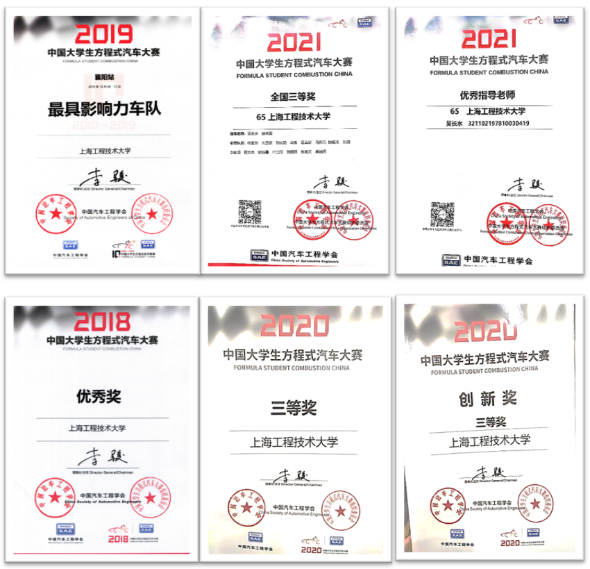 车队自参赛以来,多次获得优异赛绩。曾获得营销报告答辩全国第十,设计报告全国第七名;总成绩二等奖、三等奖;获得效率测试全国第三、保时捷杯视频大赛一等奖、蔚来杯短视频挑战赛全国第三;获得全国大学生卡丁车大赛总决赛冠军1和季军各1次。同时车队每年指导大学生创新创业项目4组以上,受益学生人数达200人以上。