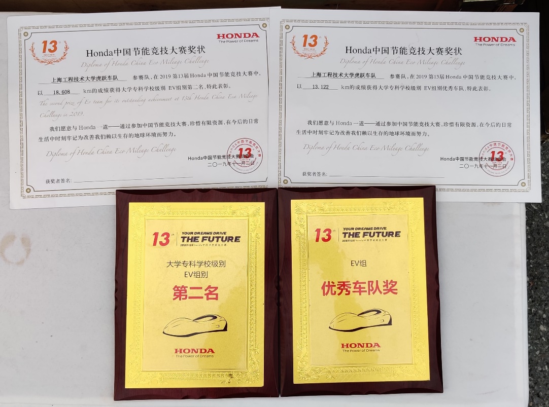 2019年10月31日至11月3日,在广东肇庆国际赛车场举办2019Honda中国节能竞技大赛,期间共有来自全国的高校和企业的66支电车(EV)代表队和70支燃油(EP)代表队。经过激烈角逐,我校金沙威尼斯欢乐娱人城虎跃车队获得佳绩,以18608km成绩获得EV组别第二名,并荣获优秀车队奖。