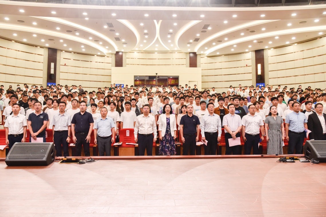 不同于以往的常规议程,此次开学典礼暨入学教育是以一堂思政大课的形式向新生们呈现。这堂大课共包括六节小课,分别从院史教育、讲师团宣讲、课程思政、生涯教育、青年风采和入党启蒙教育等多个角度,为同学们带来了一场精彩生动的“全景式”“沉浸式”思政大课。典礼在庄严肃穆的国歌声中正式开始。