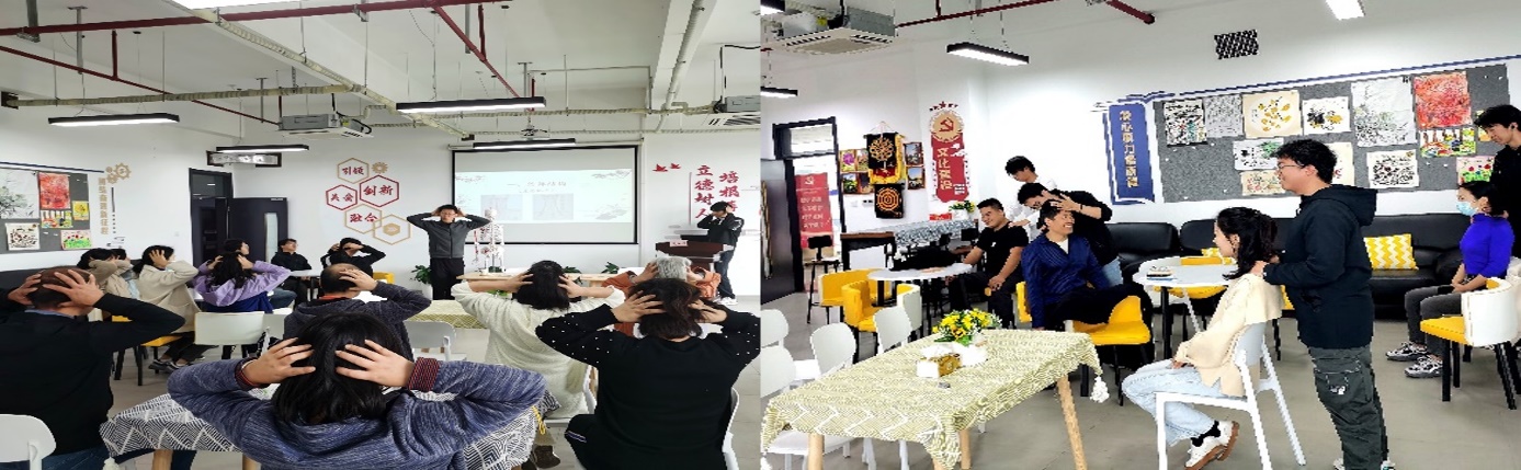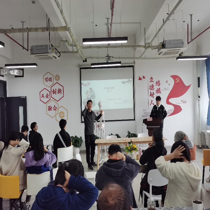 讲座以中医推拿为主题,主要从颈部结构、常见病症、预防及调理等方面展开介绍,提醒大家未病先防、既病防变、瘥后防复,旨在提高单位职工的健康意识,引导职工健康生活。武老师通过贴近生活的丰富实例介绍了颈椎和颈部按摩手法、近视缓解和情绪疏导手指操等方面的相关知识和实操动作,并针对职业中常见的亚健康状态进行了现场讲解,让职工更直观地了解穴位与身体的关系。讲座结束后,大家针对自己及家人的健康问题进行了咨询,武老师向大家进行了分析,并推荐了较好的调理方法。最后,武老师带来的学生团队在武老师的带领下,为部分老师进行了现场推拿理疗,老师们反应效果良好。