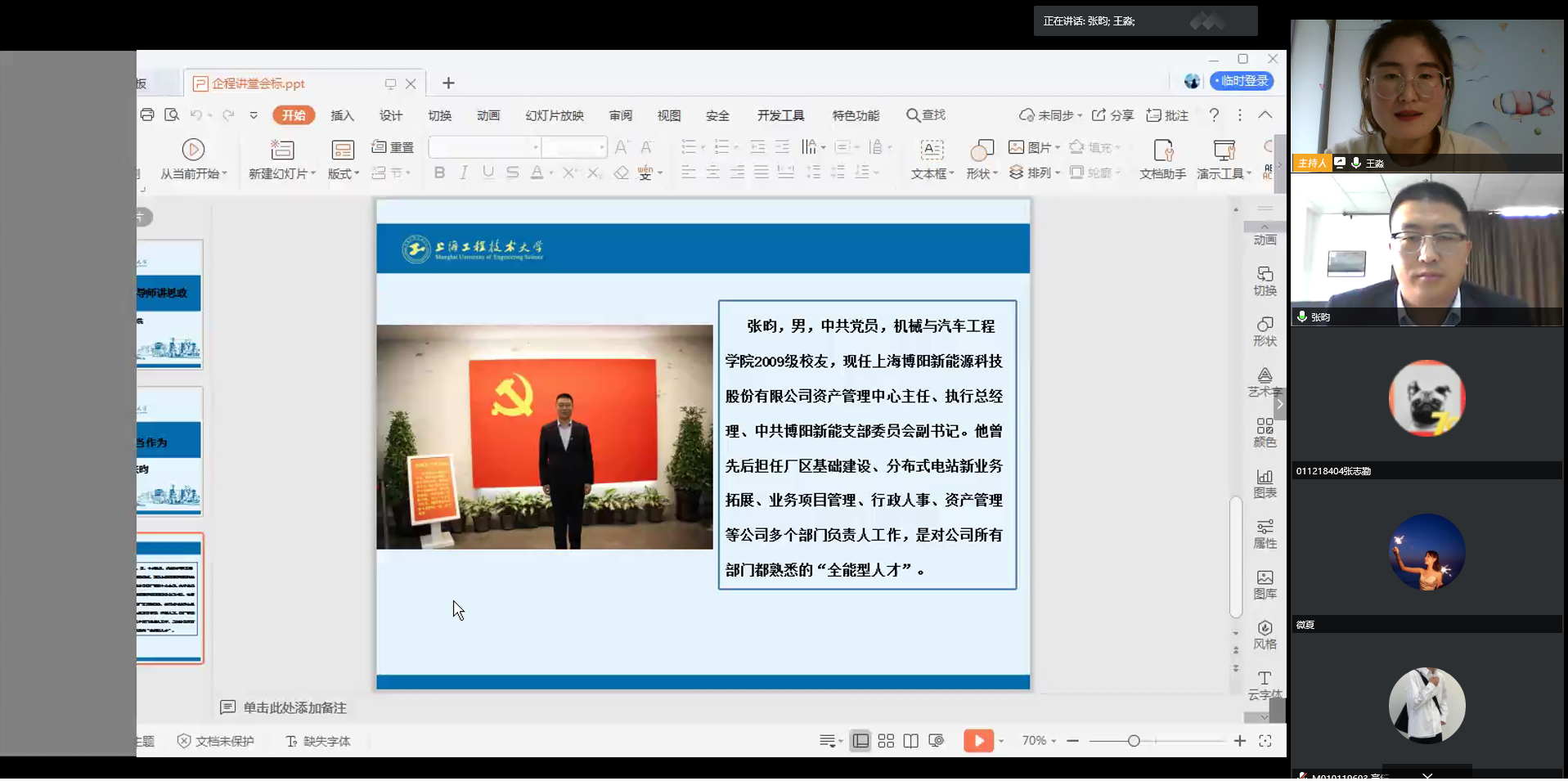 在抗击疫情的特殊时期,为进一步落实立德树人根本任务,打造课程思政生态圈,实现专业教育与思想教育的同向同行,金沙威尼斯欢乐娱人城于4月17日邀请学院产学合作基地单位上海博阳新能源科技股份有限公司资产管理中心主任、执行总经理、中共博阳新能支部委员会副书记,同时也是我院优秀校友的张昀校友通过“云端”企程讲堂为学弟学妹们分享他“历练成长,担当作为”的故事。