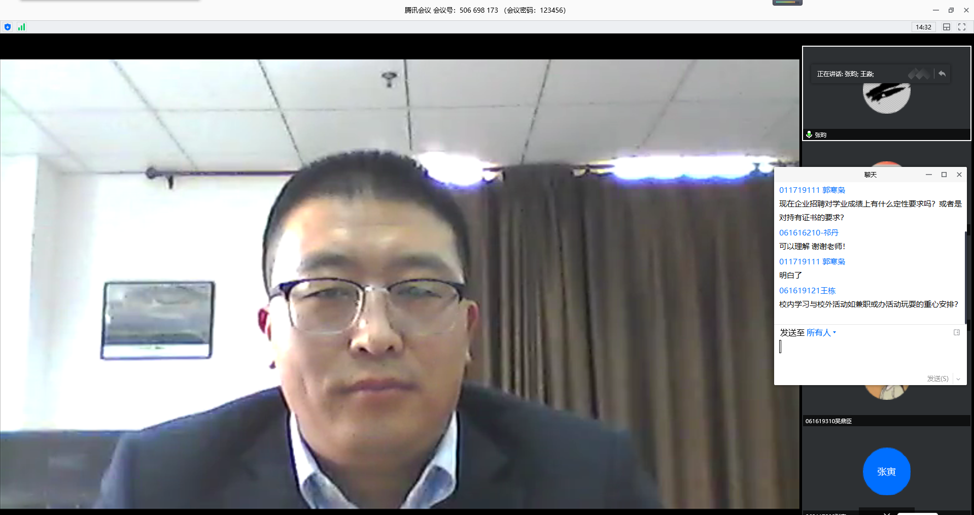 随后,同学们就专业就业方向、时间科学规划、党员作用发挥等问题积极与张昀校友进行互动。同学们表示,此次张昀校友的“企程讲堂”干货满满,给了他们很多思考和启发。虽未见面,但是同学们仍然在“云端”为张昀校友送上了掌声!